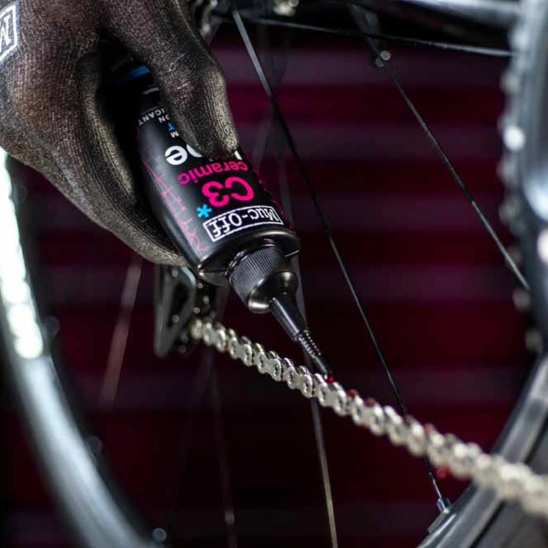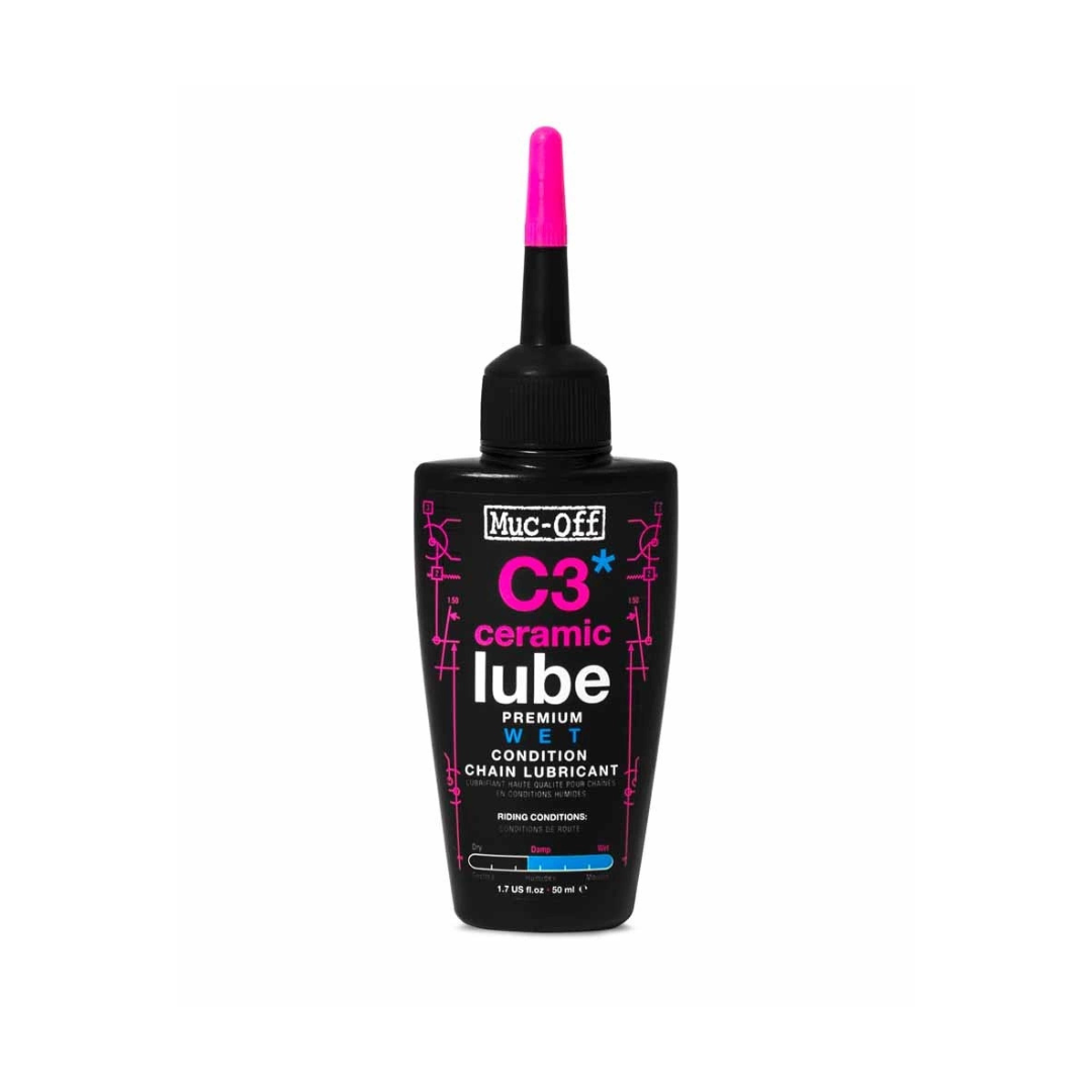 MUC-OFF SMAR DO ŁAŃCUCHA C3 Wet Ceramic Lube 50ml Sekretem smaru do łańcucha C3 Ceramic Wet Chain Lube jest unikalna powłoka ceramiczna, która zapewnia niesamowitą trwałość i wydajność na długich dystansach, na wszystkich łańcuchach rowerowych. Innowacyjna formuła naszego oleju do łańcuchów wykorzystuje również azotek boru, aby zapewnić ultra-niskie tarcie dla maksymalnej wydajności napędu, wysokiej wydajności i trwałości. Wodoodporne właściwości Muc-Off C3 Ceramic Wet Chain Lube oznaczają również, że Twój napęd będzie doskonale sprawował się w najtrudniejszych warunkach jazdy. Korzyści: