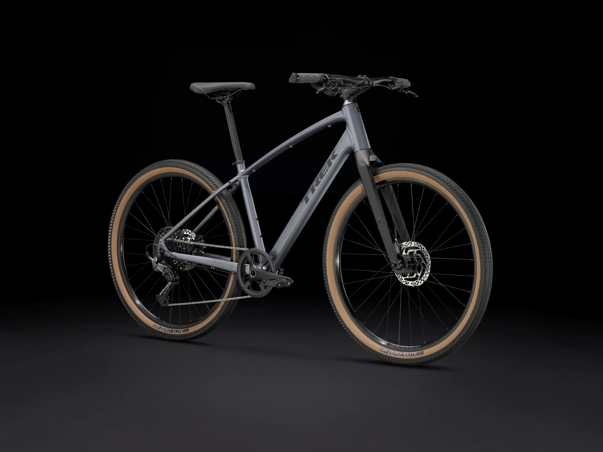 Dual Sport 3 to wydajny, wszechstronny rower hybrydowy, który zjeżdża z szosy na nierówny grunt z łatwością. Ma lekką ramę i prosty napęd 1x Shimano CUES o szerokim zakresie przełożeń. Jego szerokie koła Bontrager Kovee i opony na szuter pochłaniają wyboje i nierówności terenu dla komfortowej, pewnej jazdy po szosach, ubitych drogach i gruntowych ścieżkach.