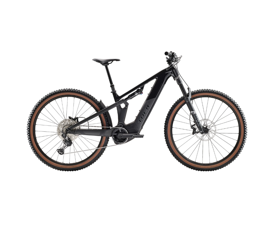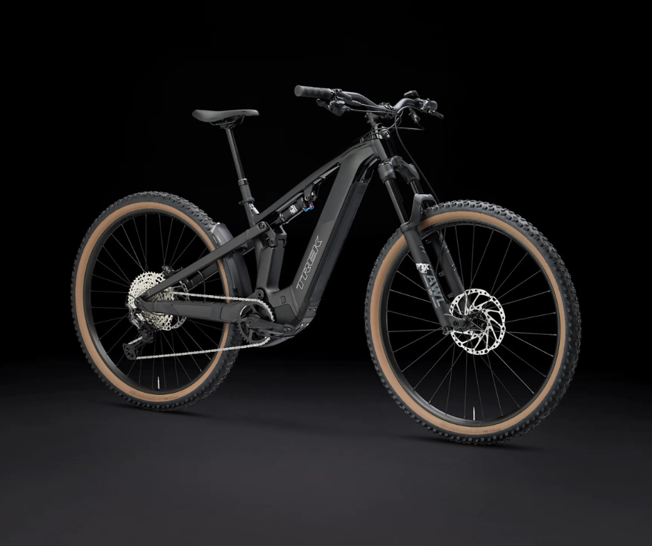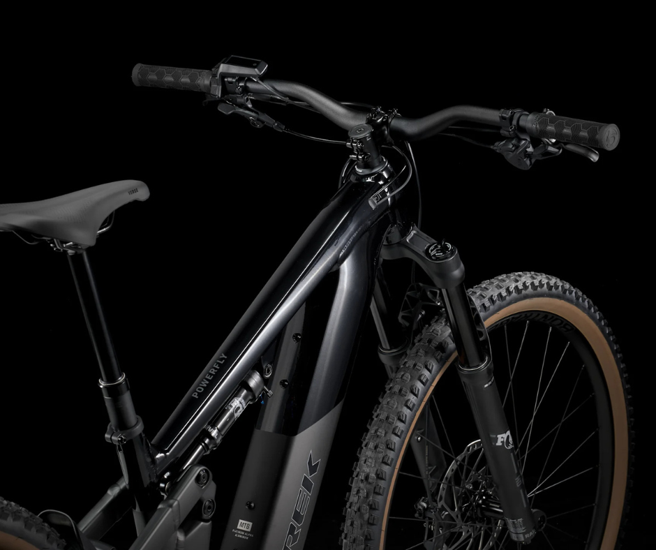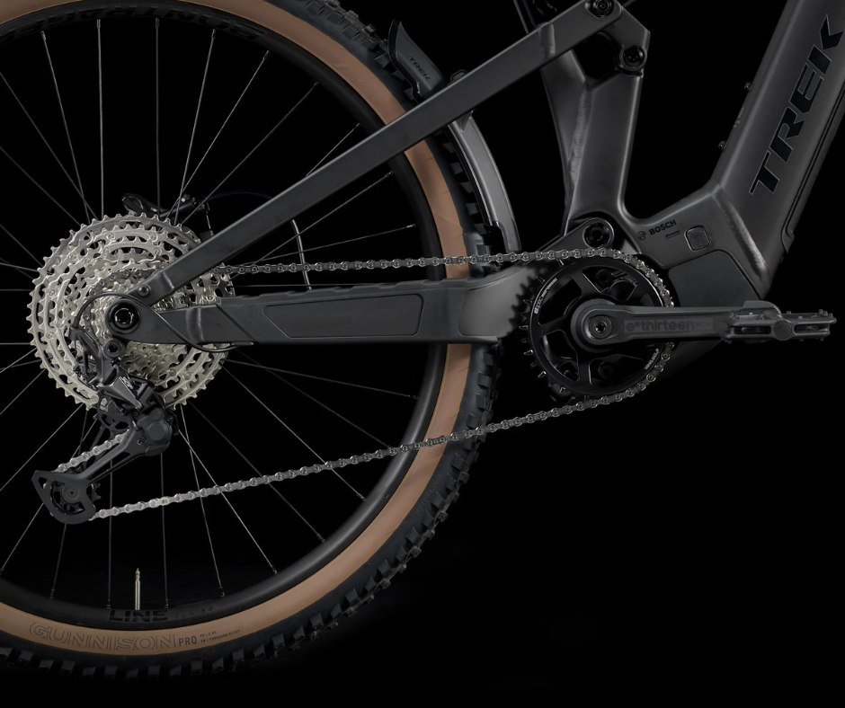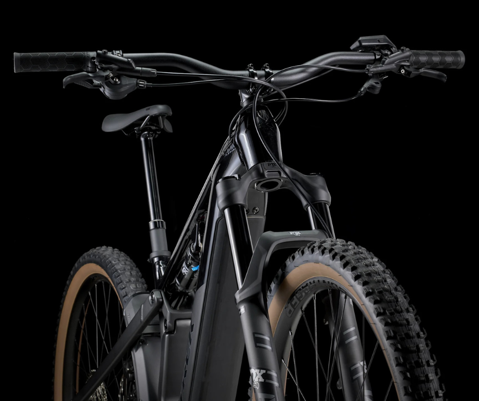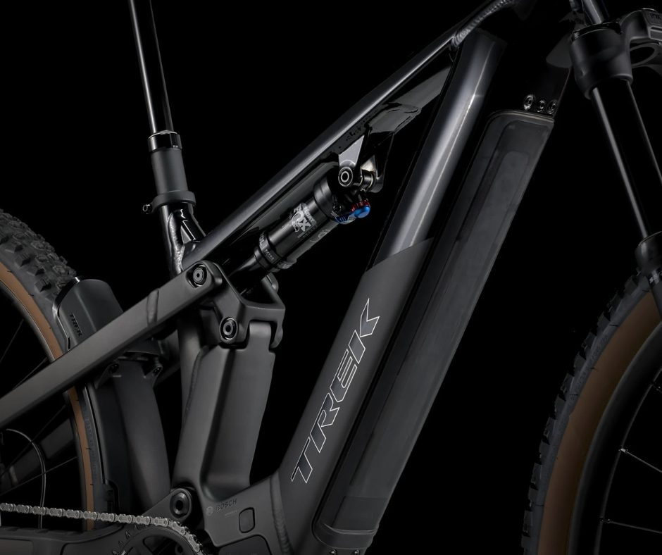 Rama z Alpha Platinum Aluminium i silnik Bosch Performance Line CX (85 Nm, 250 W), ogromny wymienny zintegrowany akumulator 800 Wh PowerTube RIB 2.0 oraz kontroler Purion 200. Zawieszenie o skoku 130 mm z przodu i 120 mm z tyłu w postaci widelca FOX Float AWL ze sprężyną powietrzną i tłumieniem RAIL 2.0 oraz dampera FOX Float Rhythm. Gotowe na montaż bezdętkowy koła z odpornymi na przebicia oponami o szerokości 2,4”, pracujący jedwabiście 12-biegowy napęd Shimano SLX, sztyca regulowana Bontrager Line i hydrauliczne hamulce tarczowe.