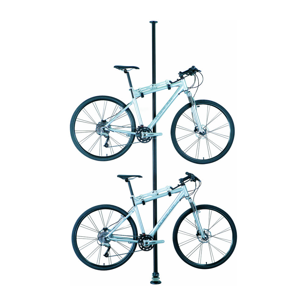 Nowoczesny i elegancki stojak do przechowywania rowerów, a także system wystawienniczy. Regulacja wysokości do 320 cm. Uchwyty rowerowe można regulować w zakresie 0-30 stopni, aby pomieścić rowery z pochyłymi ramami. Podstawy z gumy dla ochrony podłogi i sufitu. W komplecie 2 wieszaki, może pomieścić do czterech opcjonalnych uchwytów.