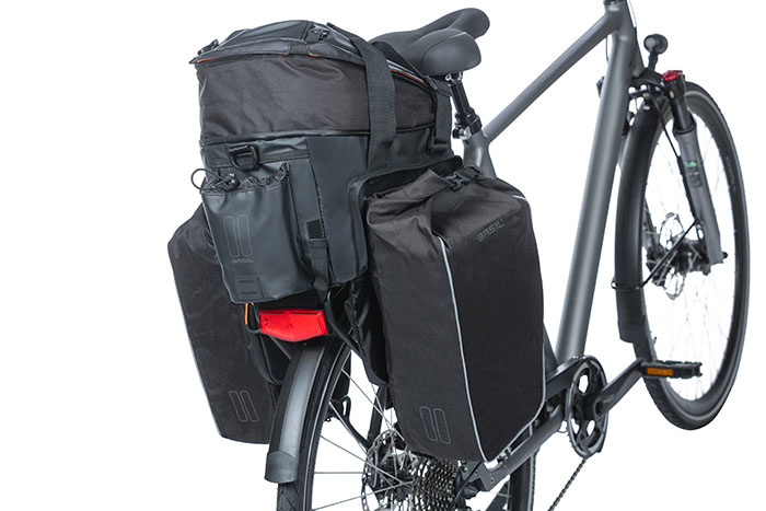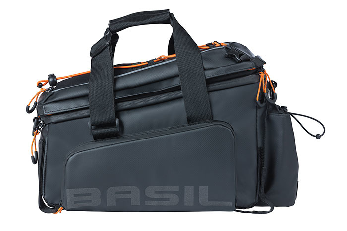 Basil Miles Tarpaulin XL Pro to sportowa torba na bagażnik w kolorze czarno-pomarańczowym. Ta sakwa nadaje się zarówno do rowerów damskich, jak i męskich.