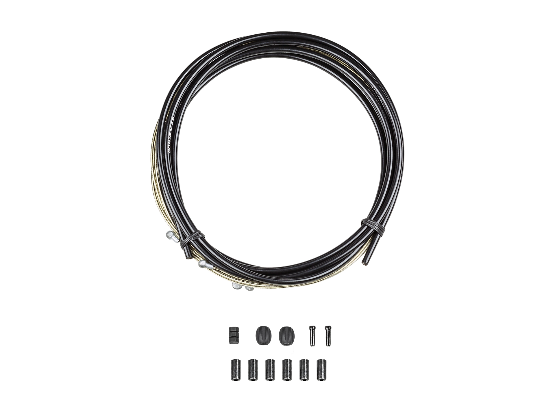 Kit includes lubed housing, stainless steel low-friction cables, ferrules, frame protectors, and cable end caps for front and rear shifting.
